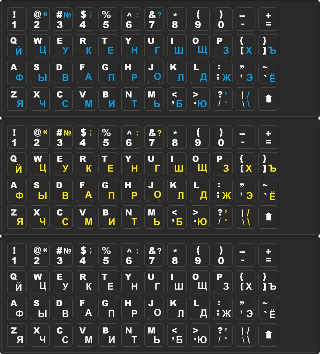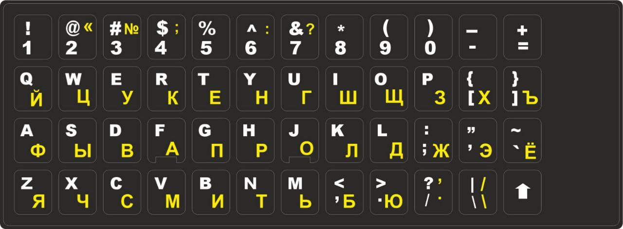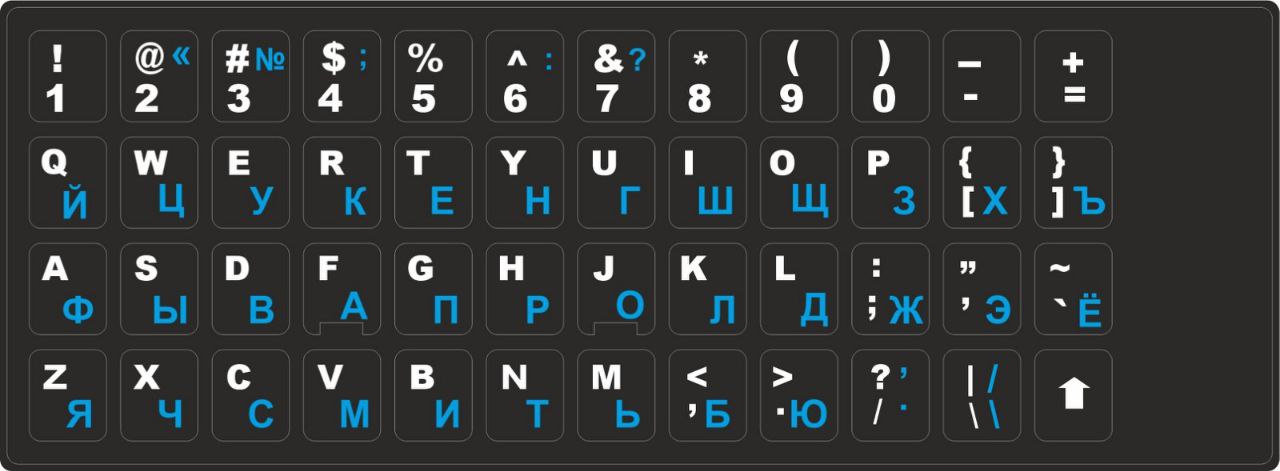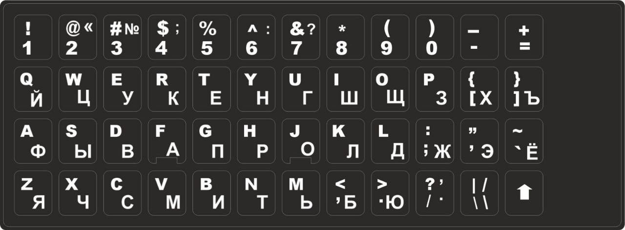 - Черные наклейки на клавиатурус белыми символами используются на темных кнопках;