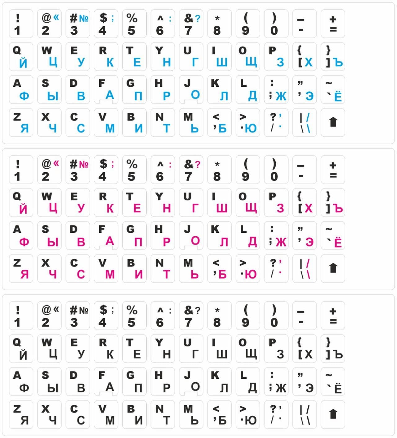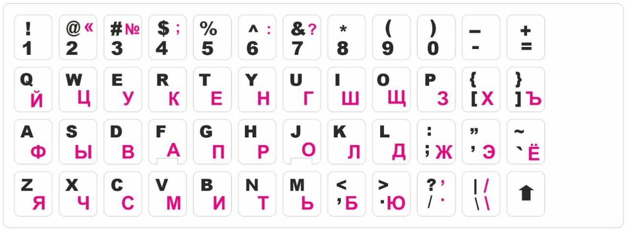 При выборе цвета стоит обратить внимание на то, чтобы символы были контрастными и хорошо выделялись на фоне клавиатуры. Но цветовое решение – не единственный критерий выбора, важен и язык ввода информации. Как правило, используются наклейки на клавиатуру с русскими буквами, на которых представлены и символы латиницей. Это удобно при необходимости периодически переключать язык ввода.