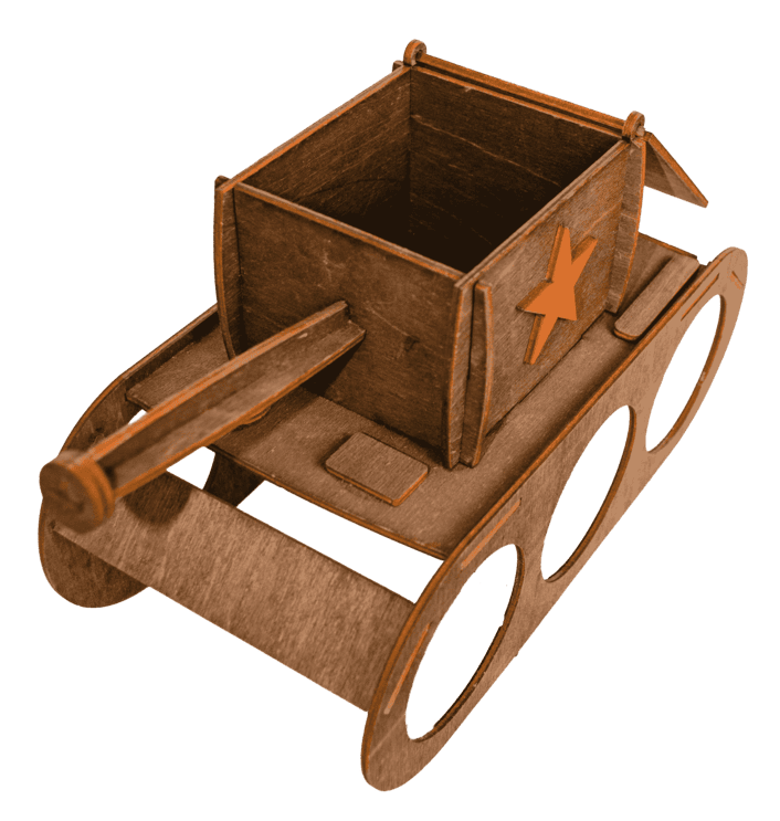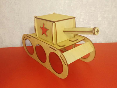 Выше, вскользь, была информация, что танки изготавливаются из природного экологически чистого материала — это березовая фанера толщиной 3 мм, фанера первого сорта. Приятный цвет фанере придает водная морилка, которая не имеет запаха. Затем фанера сохнет 10 дней при температуре 20-15 градусов. Далее дизайнер подготавливает макет сувенирного танка в векторном виде для лазерной резки. Производится пробная резка первого танка, далее его сборка, уточнение всех нюансов и неточностей, все подгоняется с точностью до 0,1 мм. Все сделано настолько точно, что банки с пивом вставляются легко, и при этом не выпадают со своих посадочных мест!